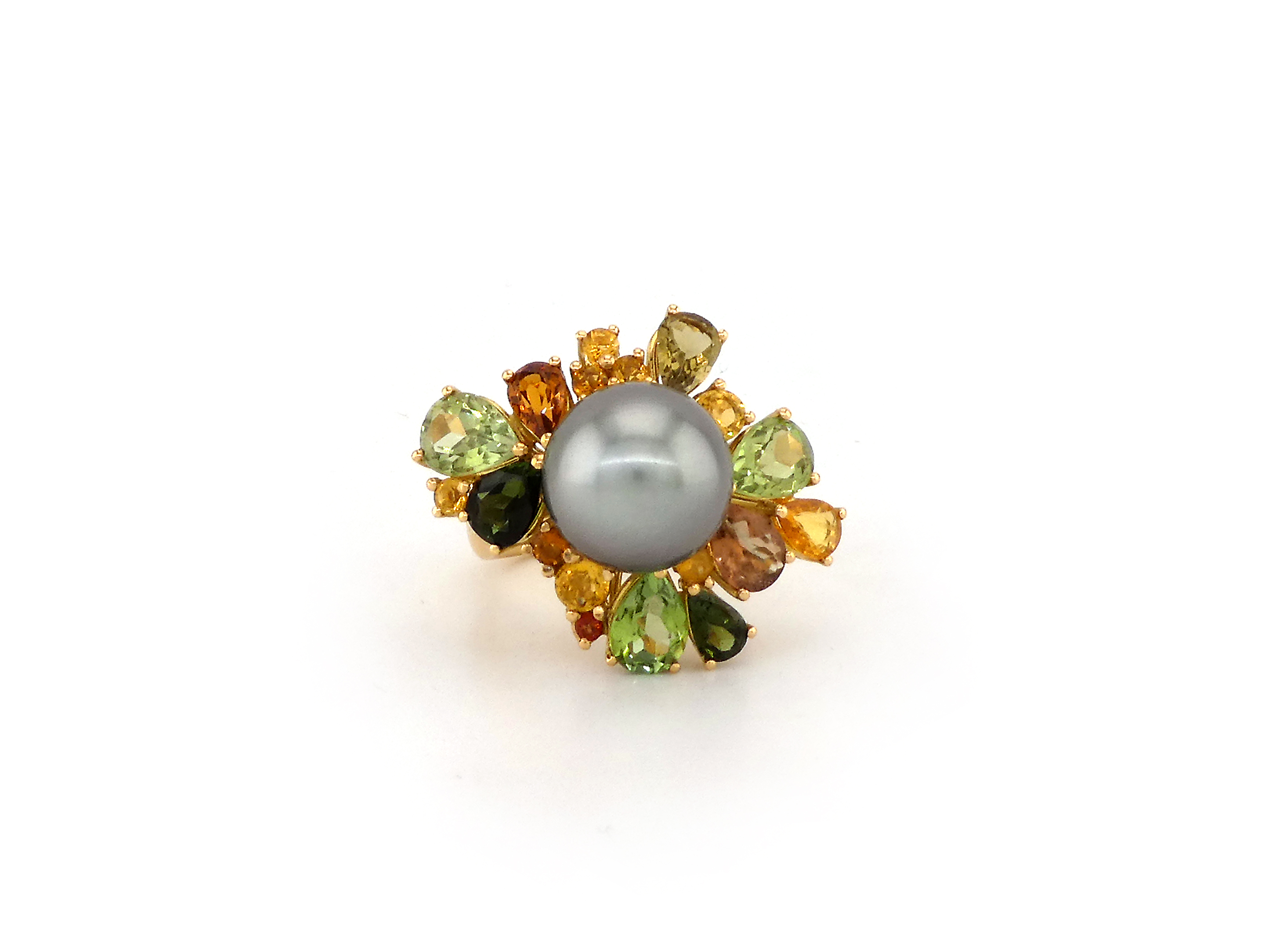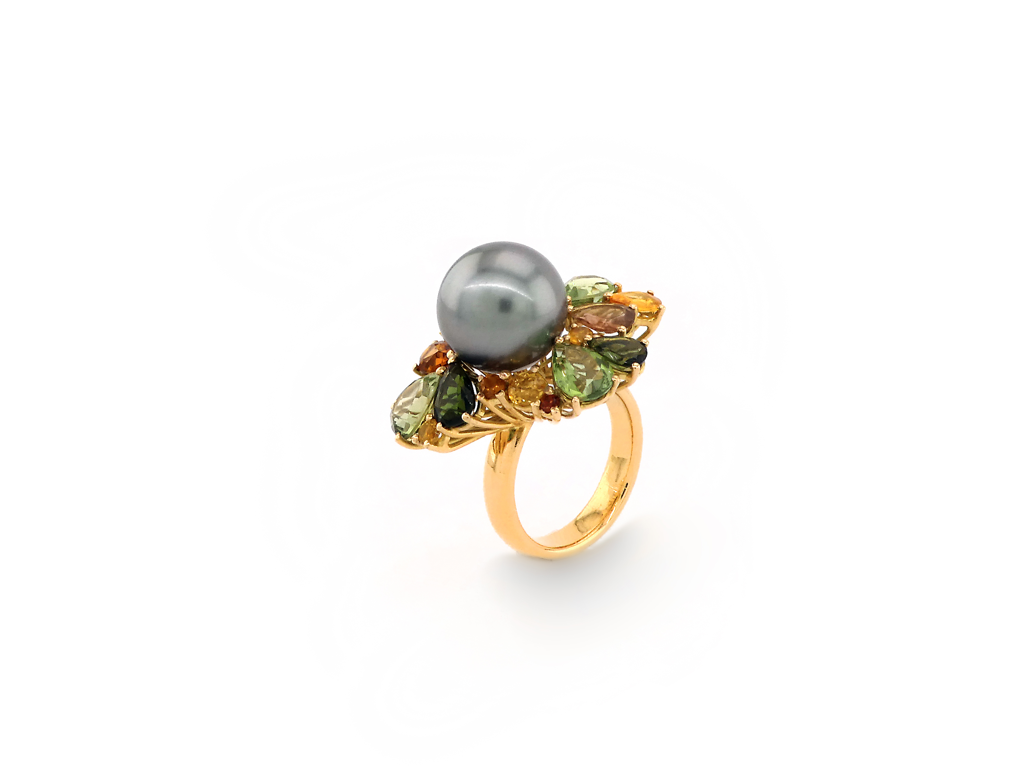 Baskania Yellow Gold Ring with Tahiti Pearl & Coloured Stones