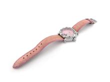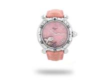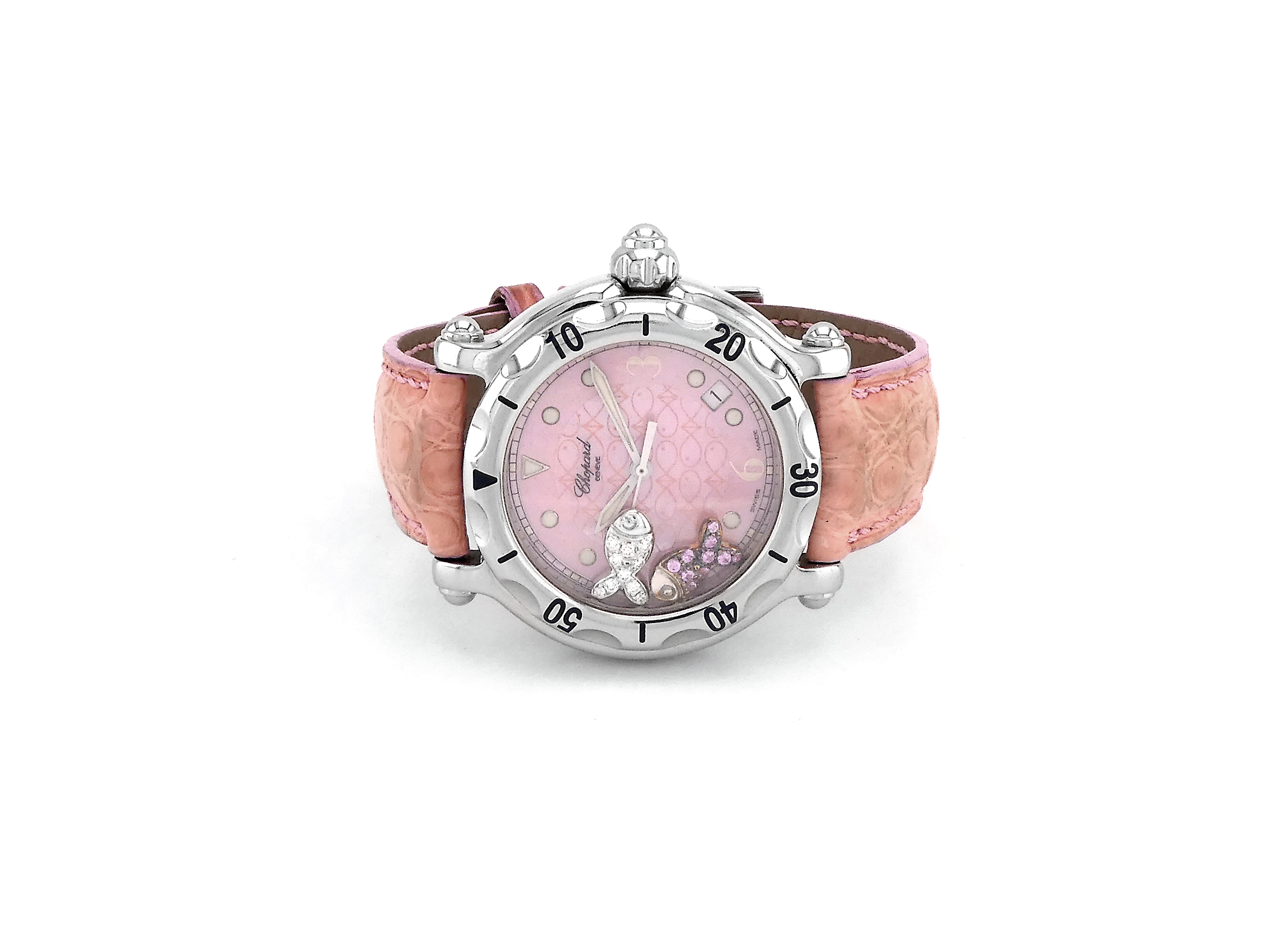 - dial : pink with white hands, date, two floating fish : one with diamonds and one with pink sapphires