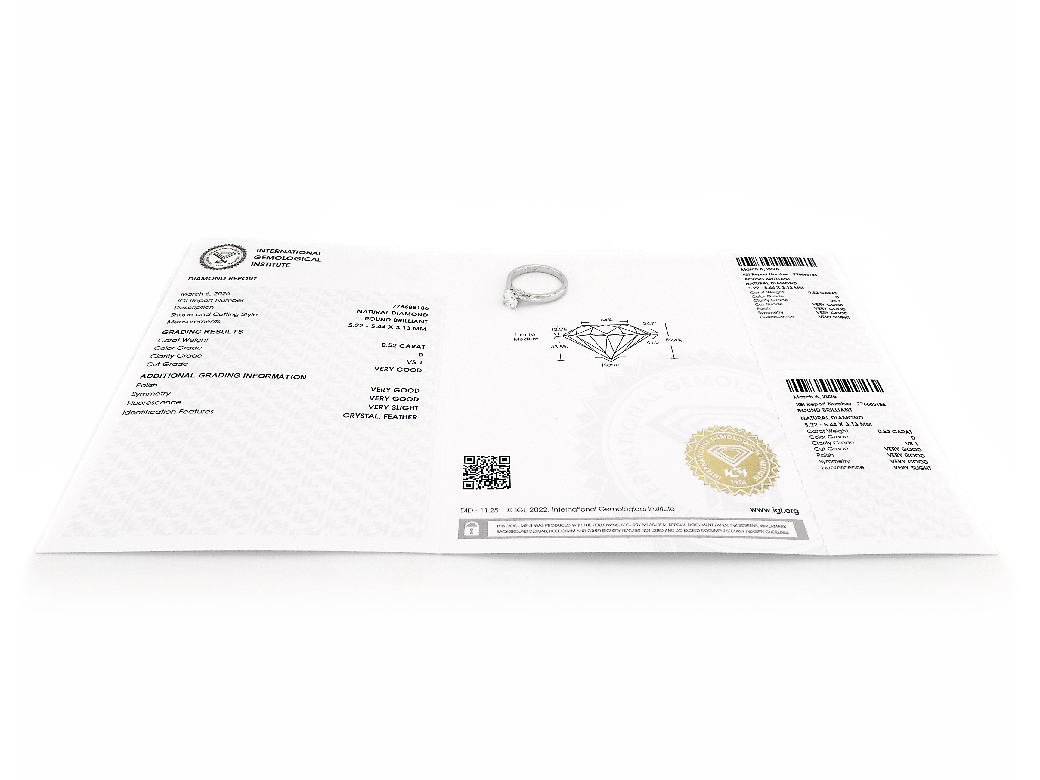 - diamond solitaire : 0.52ct brilliant cut D/VS1 (center stone)