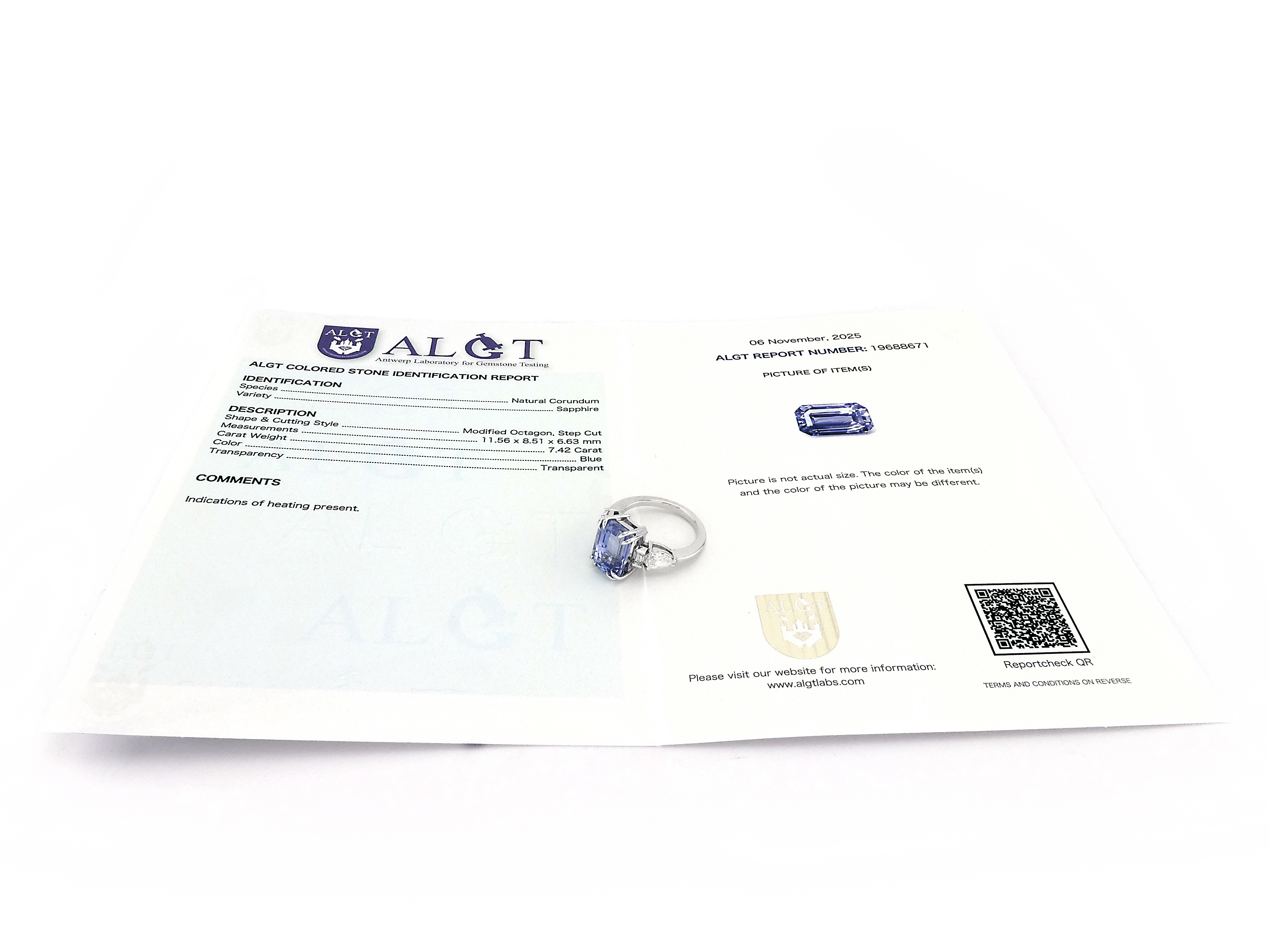 - sapphire : 7.42ct emerald cut (1 stone), delivered with ALGT certificate 19688671