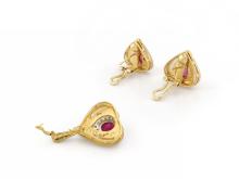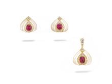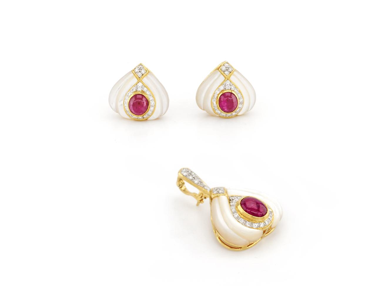 Yellow Gold Earrings and Pendant with Mother of Pearl, Diamond and Ruby